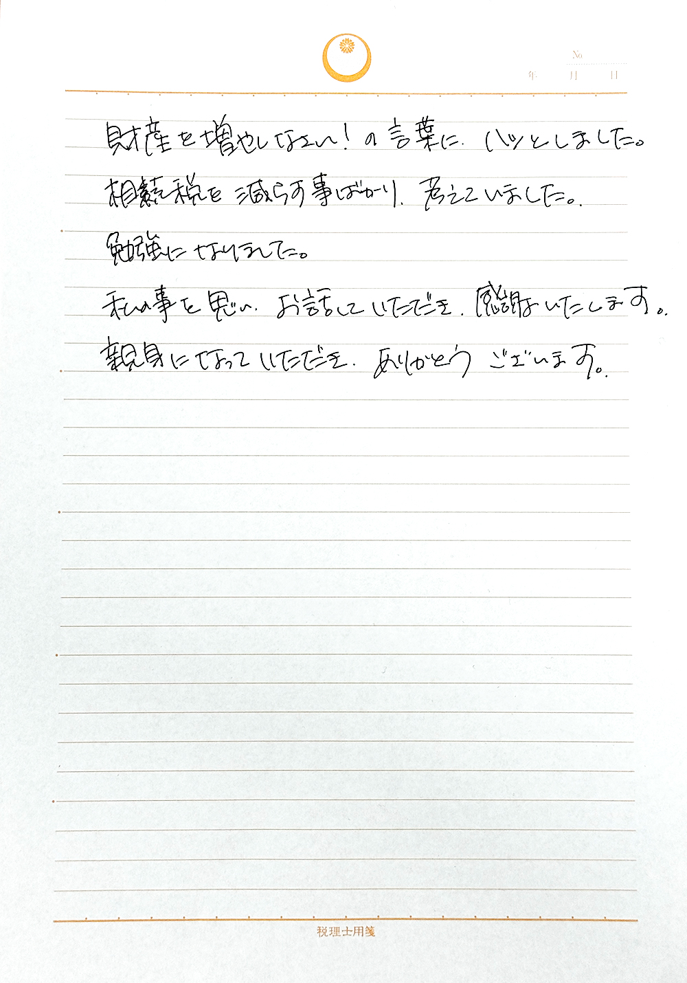 本当に信頼できる税理士先生に出会えましたので、私自身の遺言書作成もお願いしました。これで安心して生きていけます。